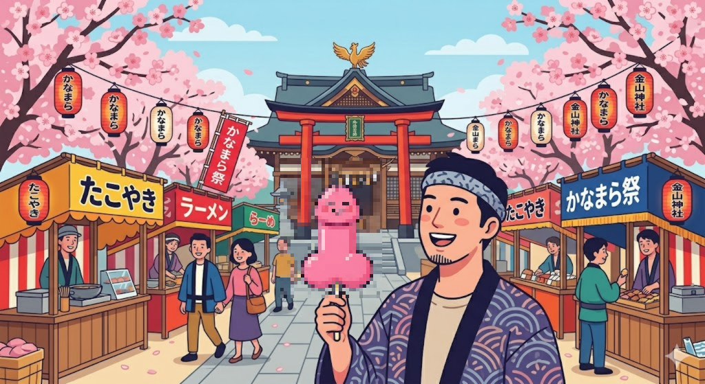 毎年4月の第一日曜日、神奈川県川崎市の金山神社(若宮八幡宮境内)は、世界中から集まった数万人の熱狂に包まれます。その中心にあるのは、空高く掲げられた巨大な「ピンクの男根神輿」と、老若男女が手に持つ「あのアメ(かなまら飴)」です。